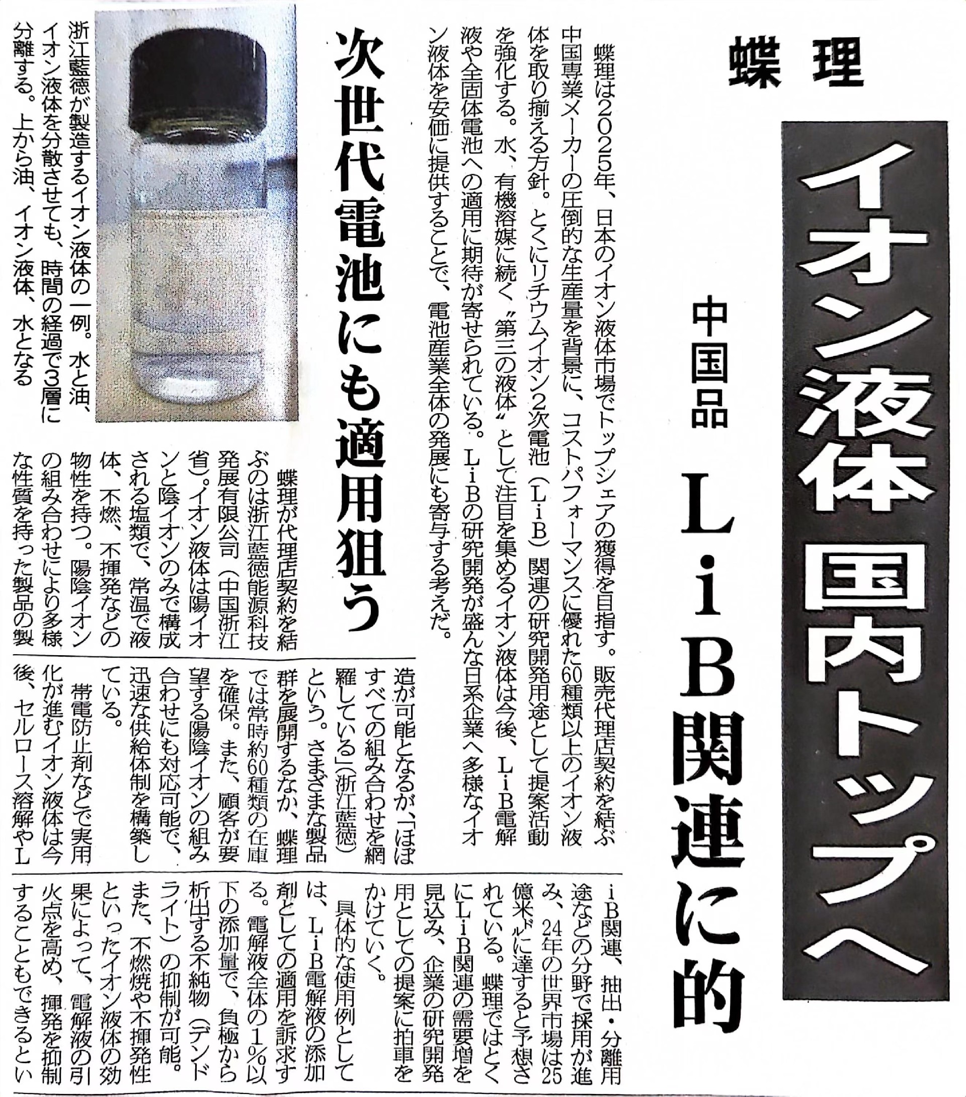 জাপানি রাসায়নিক শিল্পে প্রতিদিন 10 জুলাই, 2023 -এ, ঝেজিয়াং এলডিইটি এনার্জি টেকনোলজি ডেভলপমেন্ট কোং, লিমিটেডের প্রাসঙ্গিক বিষয়বস্তু (এরপরে "এলডিইটি প্রযুক্তি" হিসাবে পরিচিত) ব্যাপক মনোযোগ আকর্ষণ করেছিল। "নতুন শক্তি ব্যাটারি ইলেক্ট্রোলাইটে আয়নিক তরল প্রয়োগ" শিরোনামে এই প্রতিবেদনটি নতুন শক্তি প্রযুক্তির ক্ষেত্রে এলডিইটি প্রযুক্তির গুরুত্বপূর্ণ গবেষণা ফলাফলের বিবরণ দেয়।